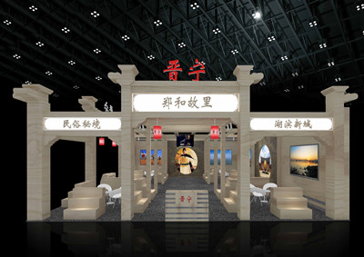 设计构想:晋宁历史从古滇起就可以追溯,所以成就了晋宁深厚的文化渊源;而今的晋宁,是昆明主城第六区,六大文化元素促推晋宁文化产业发展。2018年晋宁展区,将演变晋宁文化历史的发展,整个场馆的装修设计以“文化演变”为主线,即从古滇文化起源,发展到现今的“湖滨新城”,里面既包含了古滇的历史文化、郑和文化等,也能够展现今日的晋宁新面貌。